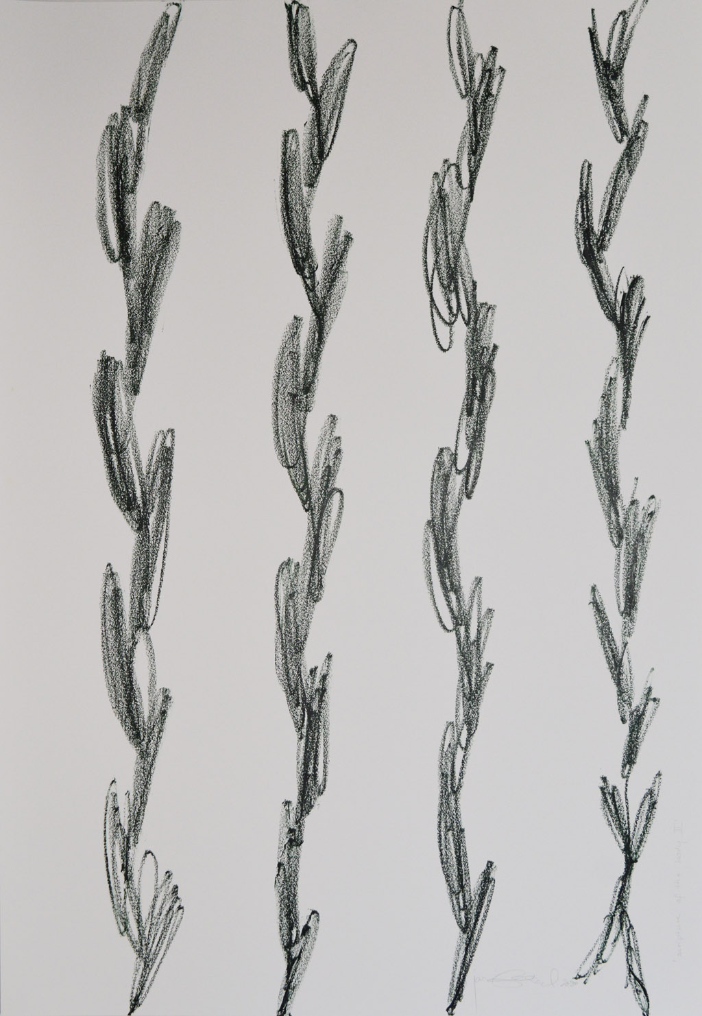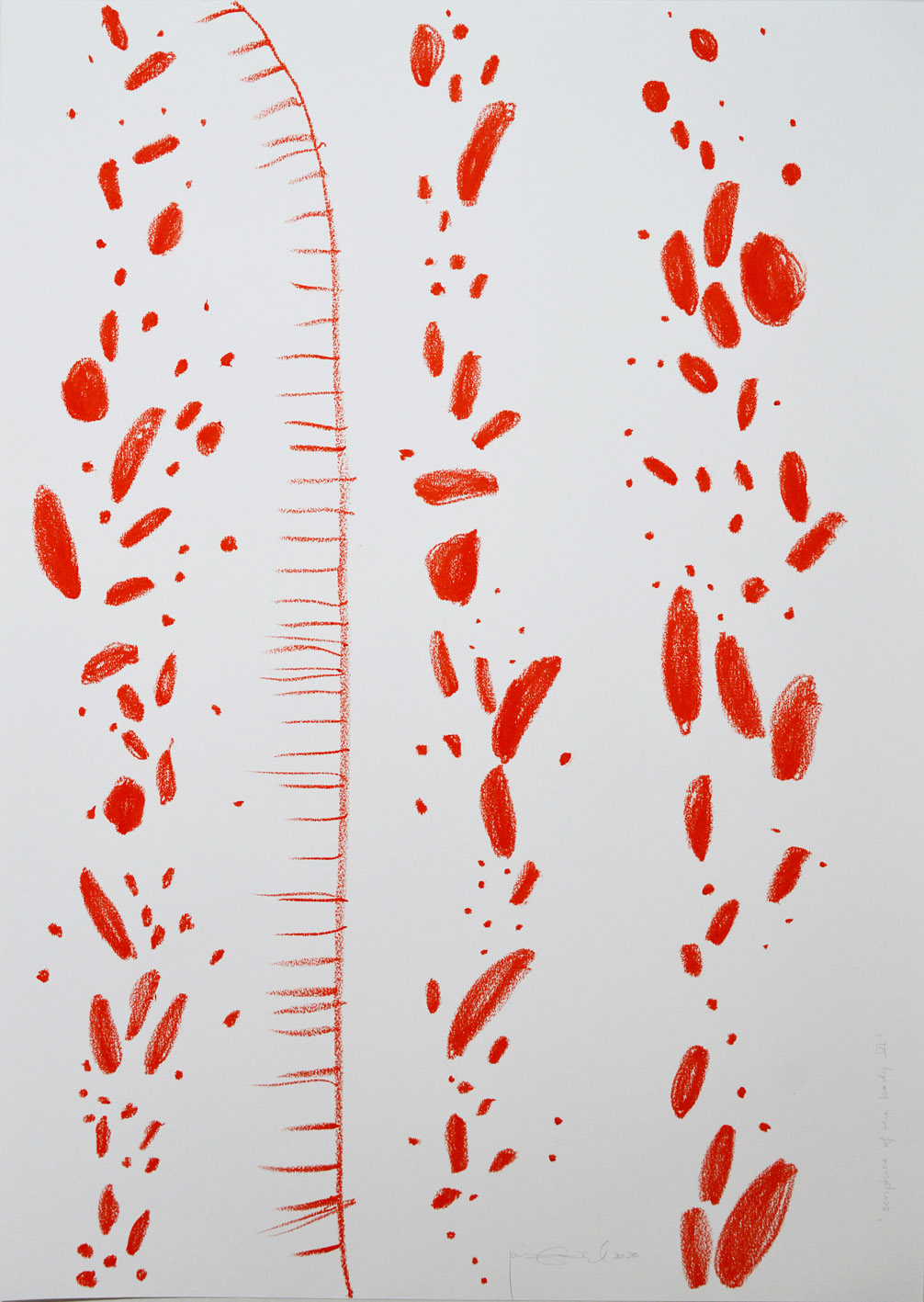 ‘songs of earths (1)'(1 in series of 9), 2024, pigment, medium on paper, 24 x 30 cm.‘song of earths (2)'(2 in series of 9), 2024, pigment and media on paper, 20,5 x 28,5cm.installation view ‘collection of strokes’, 2022, series of 14 prints, engraving in faïence on paper, each 57 x76 cm.‘collection of strokes (7/14)’, 2022, engraving in faïence on paper, 57 x 76 cm.installation, 2022.‘painting lesson V’, 2022, acrylic on paper, 70 x 100 cm.‘painting lesson I, 2022, acrylic on paper, 70 x 100 cm.‘directions III’, 2020, xylography on paper, 53 x 77,5 cm.‘directions VI’, xylography on paper, 57x78cm, 2020.‘garden of Taberah’, 2020, ink and pencil on paper, series of drawings each 24 x 30 cm.‘washing of Andrew’s feet’, 2020, oil on canvas board, series of two, 33×24 cm.‘posture’, 2020, oilstick, ink on paper, circa 210 x 300 cm (9 sheet of paper 70 x 100 cm).‘scripture of the body (4)’, 2020, oilstick on paper, 70 x 100 cm.‘scripture of the body (2)’, 2020, oilstick on paper, 70 x 100cm.‘scripture of the body (6)’, 2020, oilstick on paper, 70 x 100 cm.‘shy (6/6’, 2013, lithography on paper, 57 x 79 cm.‘shy (all 6 prints)’, 2013, lithography on paper, each 57 x 79 cm.installation view, 2015.‘instant de passage’, 2013, lithography on paper, 56 x 76 cm.installation view, ‘instant de passage’, 2013. series of lithography ‘dwellers’, 2013, part of installation ‘hacher la farine’.installation view, drawings ‘pouring rain, shading tree’ , 2013, at the Nederlandsche Cacaofabriek, Helmond.installation view, ‘forms’, 2014.‘enveloppe vide’, installation view, 2009.‘psalms of David’, 2006, chapelle Saint Jean-Baptiste, St-Jeannet by gallery Qvadrige, presentation of artist book.exposition of series of xylographies at gallery Qvadrige (Pierre Cottalorda), Nice, 1998.