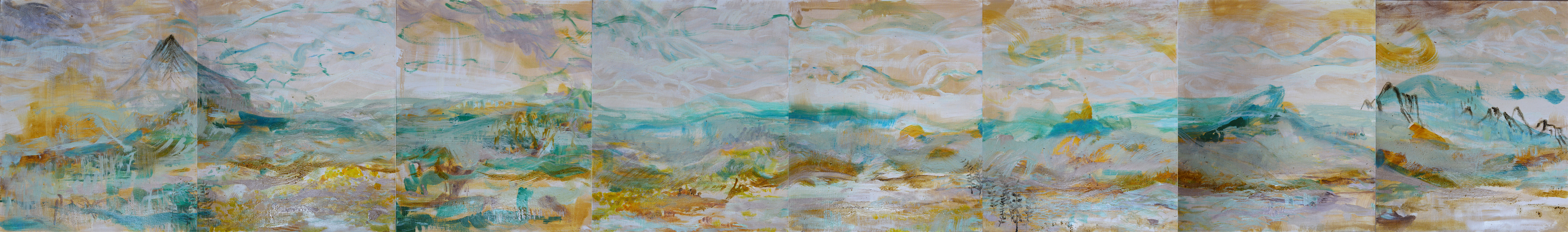 ‘from here to there’, 2025, oil on 8 canvas board (each 46 x 55 cm), 368 x 55 cm.